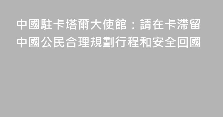 關於請在卡滯留中國公民合理規劃行程和安全回國的提醒當前,海灣地區局勢仍在演變,卡塔爾赴華航班尚未恢復,部分中國旅客在卡滯留。黨和政府對此高度重視,一直心繫大家的安危。中國駐卡塔爾使館堅持人民至上,密切關注形勢發展,全力採取措施解決在卡中國公民的關切。連日來,使館持續同卡塔爾外交部、內政部......