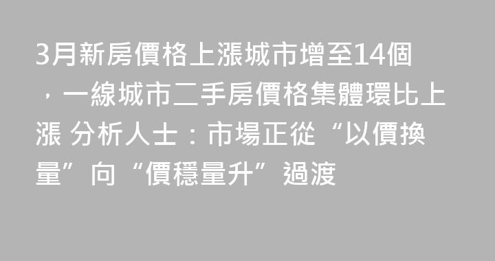 每經記者|包晶晶每經編輯|陳俊傑4月16日,國家統計局公佈的2026年3月70個大中城市商品住宅銷售價格變動情況顯示,一線城市新建商品住宅銷售價格環比由上月持平轉爲上漲0.2%,二手房價格由上月下降0.1%轉爲上漲0.4%。70個大中城市中,新房銷售價格環比上漲城市有14個,比上月增加4個;二手......