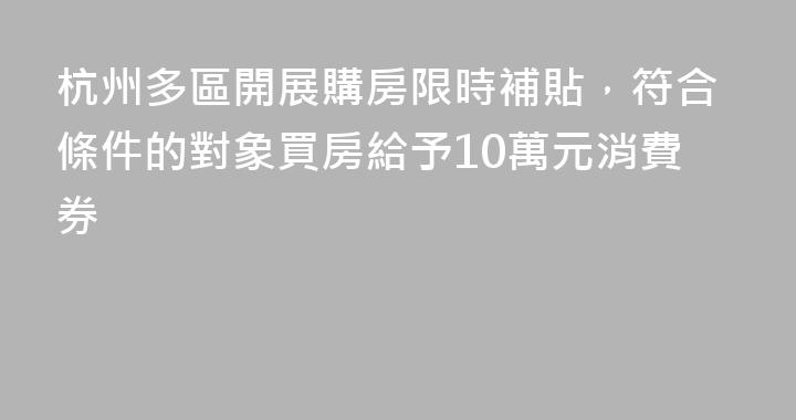 據微信公衆號“杭州住保房管”消息,10月24日,浙江省杭州市部分區縣市發佈公告,將於近日開展“購房+消費券”限時補貼活動。其中,富陽區、臨安區、桐廬縣、淳安縣、建德市的文件顯示,對符合條件的購房對象給予每套10萬元的消費券補貼,五個區縣消費券總額爲5600萬元。據悉,蕭山區、餘杭區、臨平區、錢......
