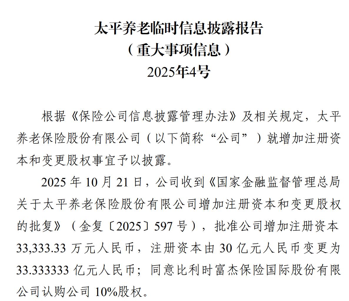 日前,太平養老保險股份有限公司(以下簡稱“太平養老”)宣佈增資及變更股權獲批。根據公告,太平養老已收到金融監管總局的批覆,批准其增加註冊資本3.33億元,註冊資本由30億元增至33.33億元。同時,同意比利時富傑保險國際股份有限公司(以下簡稱“比利時富傑”)認購公司10%股權,由此,比利時富傑成......