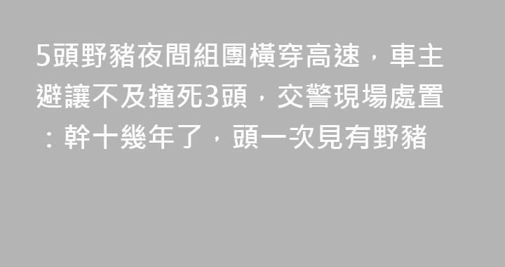 10月21日,山西太原。當事車主郭先生稱當天十一點左右,在太原繞城高速上行駛,因視線不清楚,到跟前才發現有一排野豬組團橫穿高速,根本來不及避讓撞死了三頭。“事故導致車輛保險槓基本全壞,安全氣囊也炸出來了。”郭先生稱當時人有點蒙,慶幸人沒有受傷,後來交警到場處置事故時也表示,幹十幾年了,頭一次......