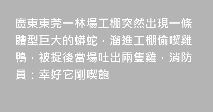 10月17日,據當地媒體報道,廣東東莞一林場工棚突然出現一條體型巨大的蟒蛇,林業工人馬上報告消防等部門請求抓捕。當時捕蛇人員到達現場後,發現蟒蛇因偷喫附近養殖的雞鴨後,正盤踞地面休息,隨後合力將其抓捕。“蟒蛇受到攻擊會吐出食物逃跑,這條蛇當時吐出了兩隻雞。”消防隊員表示,好久沒遇到這麼大的蟒......