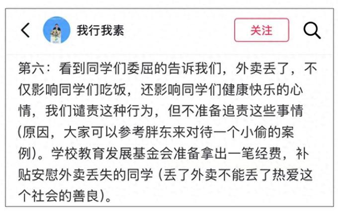“我們譴責這種行爲,但不準備追責……學校教育發展基金會準備拿出一筆經費,補貼安慰外賣丟失的同學。”近日,廣西財經學院校長範祚軍針對學生反映的外賣丟失問題,在其抖音賬號“我行我素”上如是表態,引發熱議。範祚軍還表示,“丟了外賣,不能丟了熱愛這個社會的善良”。對此,淘寶閃購率先響應,第一時間......