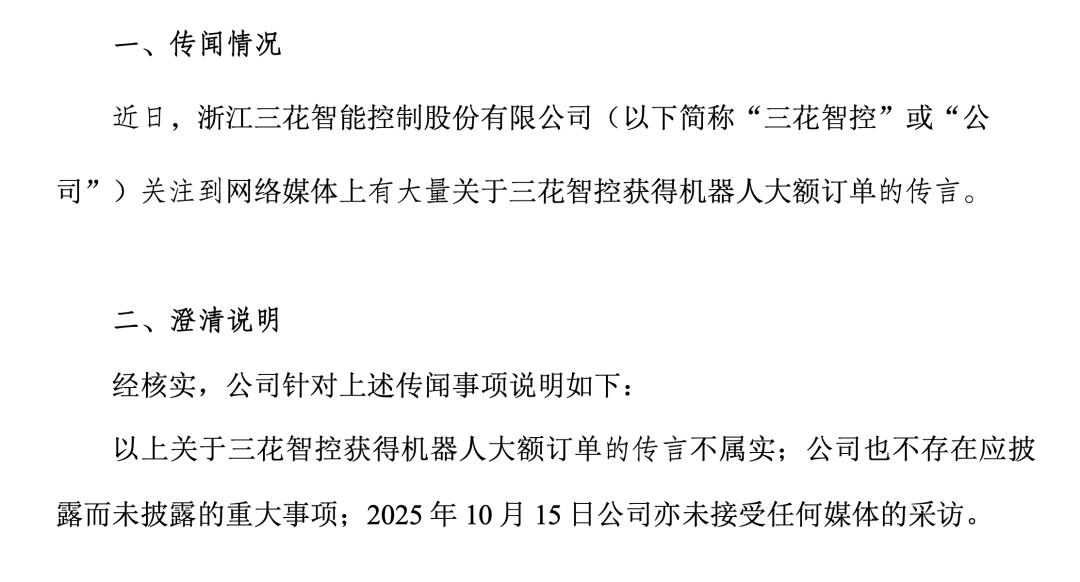 10月15日晚間,三花智控(002050.SZ)公告稱,近日關注到網絡媒體上有大量關於公司獲得機器人大額訂單的傳言,經覈實,該傳言不屬實;公司也不存在應披露而未披露的重大事項;10月15日公司亦未接受任何媒體的採訪。10月15日,三花智控尾盤強勢拉昇封漲停,截至收盤,該股報44.18元/股,全日......