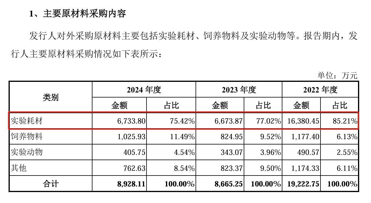 2023年以來,百奧賽圖主要原材料採購出現異常變動,實驗耗材與飼養物料採購量大幅減少。在生物醫藥研發中,實驗耗材是臨牀前研究、藥物開發的基礎物資,飼養物料則與公司核心業務之一的模式動物養殖直接相關。兩類關鍵原材料採購量同時大幅下降,與公司宣稱的“推進藥物研發”“維持模式動物業務”戰略存在矛盾。