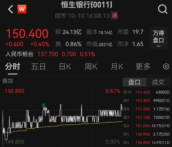 公告顯示,這一價格較恆生銀行近期股價溢價超30%。市場對此反應迅速,上述公告發布後,恆生銀行股價兩日累計上漲超25%,截至10月10日收盤報150.4港元/股。