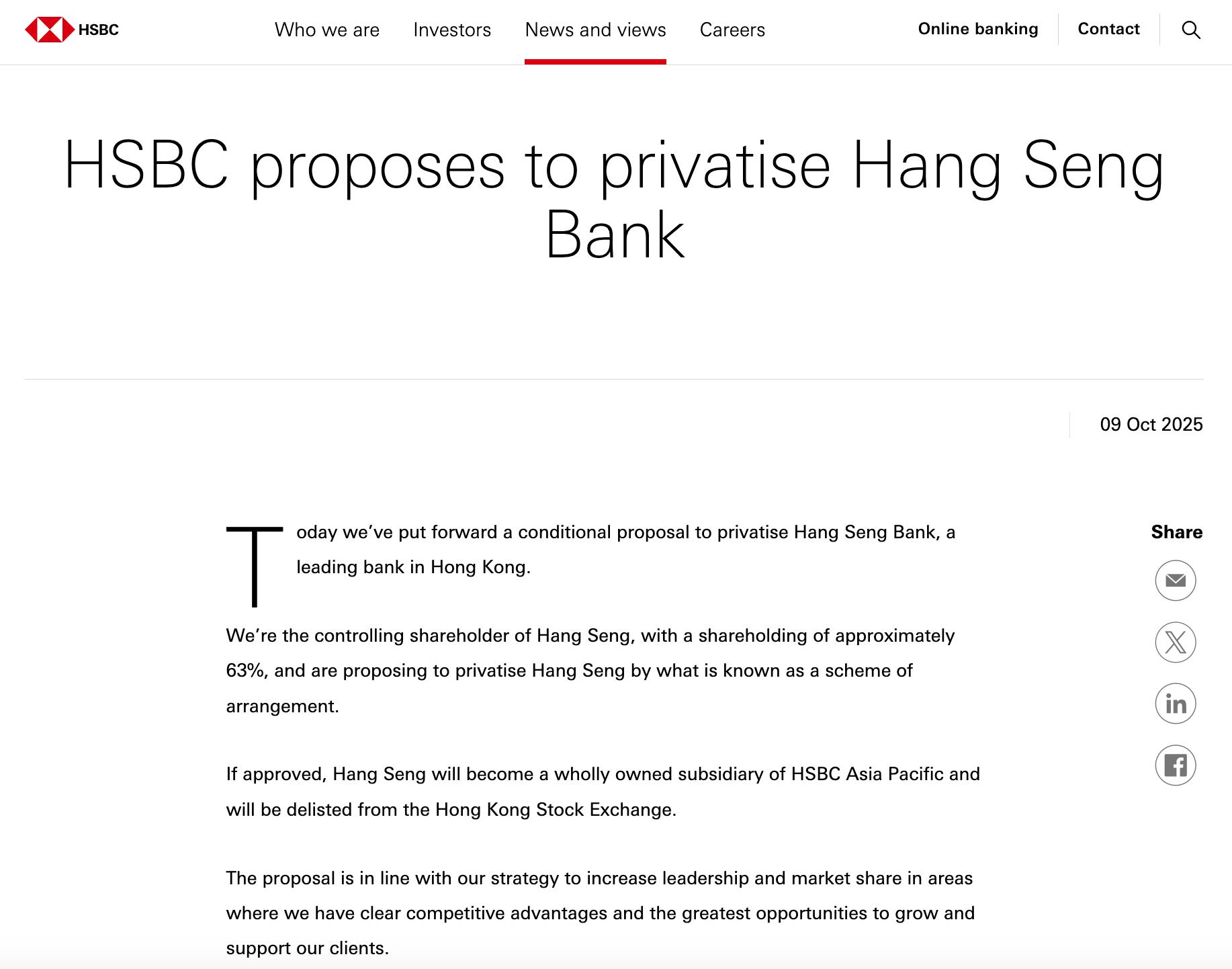 據《南華早報》報道,匯豐集團行政總裁喬治·埃爾赫德利(Georges Elhedery)週四在香港舉行的媒體圓桌會議上表示,“匯豐作爲恆生銀行100%的股東,其優勢在於能讓恆生銀行在匯豐的體系下,更靈活高效地管理資本和各項比率。”他談到,該項計劃是一項旨在實現增長的長期戰略投資,從長遠來看對所有股東都具有增值意義。