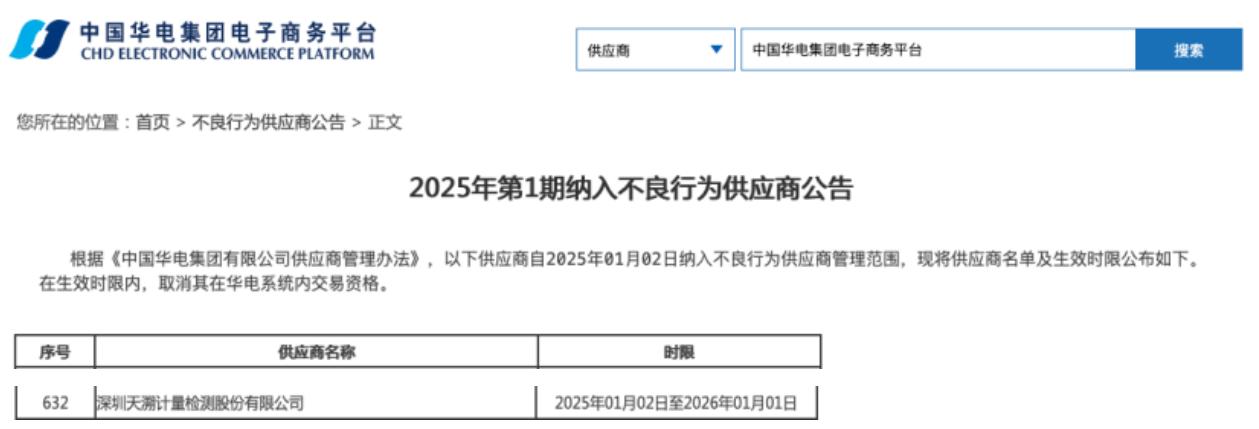 此外,公開信息還顯示,中國華電集團電子商務平臺在2025年2月8日發佈《2025年第1期納入不良行爲供應商公告》,將天溯計量納入不良行爲供應商管理範圍。