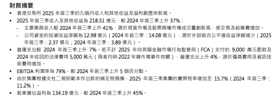 【環球網財經綜合報道】11月5日,香港交易所發佈2025年前三季度業績報告,數據顯示港交所總營收與淨利潤雙雙創下同期新高。今年前九個月,港交所總營收達218.51億港元,同比增長37%;淨利潤134.19億港元,同比增幅達45%。其中第三季度表現尤爲亮眼,單季營收77.75億港元,同比增長45%;淨利潤49億港元,同比大漲56%。