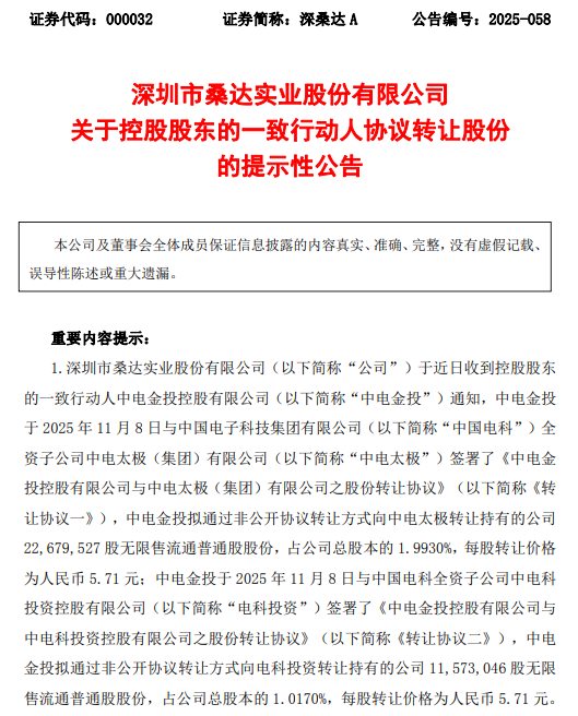 根據公告,中國電子旗下中電金投擬將其持有的深桑達A合計3425.25萬股股份(佔總股本3.01%)協議轉讓給中國電科旗下的中電太極和電科投資。交易完成後,中國電子仍爲深桑達A的實際控制人,持股比例降至44.2214%,而中國電科則將持有深桑達A 3.01%的股份。