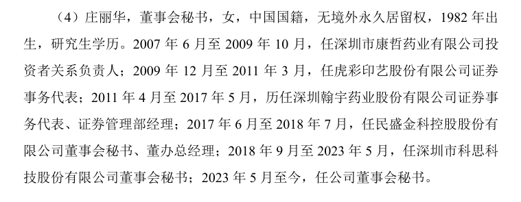 招股書顯示,莊麗華是公司董事會祕書,並通過公司員工持股平臺投資發展中心持有公司股票。公開信息顯示,入職恆運昌前,莊麗華在上市公司科思科技任董事會祕書。2023年5月24日,科思科技公告稱莊麗華辭職。