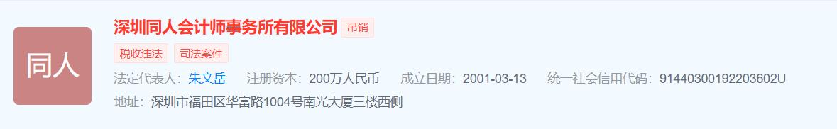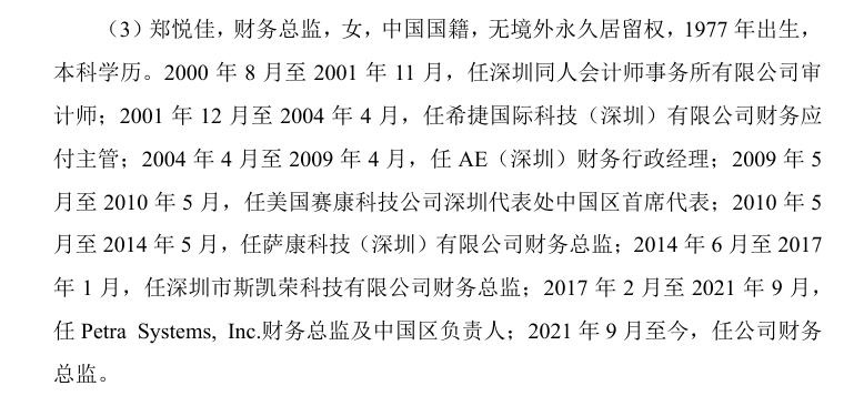 不止莊麗華,財務總監鄭悅佳的履歷同樣與公開信息衝突。招股書顯示,鄭悅佳2000年8月入職深圳同人會計師事務所有限公司任審計師,但該事務所實際成立於2001年3月,入職時間早於公司設立近7個月;招股書還披露,2010年5月至2014年5月,鄭悅佳擔任薩康科技財務總監。天眼查信息顯示,該公司2012年便已被吊銷營業執照,且工商信息更顯示鄭悅佳在薩康科技的實際職位爲總經理而非財務總監。