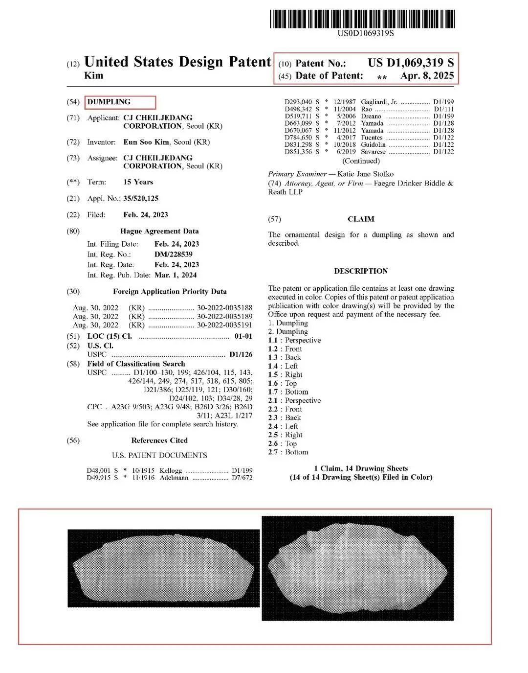 據瞭解,CJ公司共上傳了14張各個角度的餃子照片。文件還顯示,該專利申請日期爲2023年2月24日,獲批日期則爲2025年4月8日,專利的保護期限爲15年。