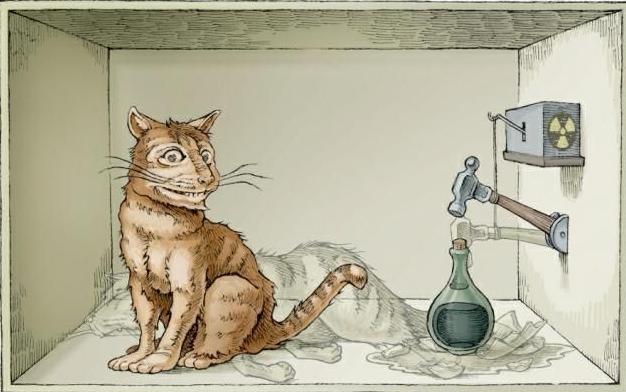 作爲愛因斯坦的支持者,薛定諤提出了一個著名思想實驗“薛定諤的貓”。實驗設想將一隻貓關在裝有少量鐳和氰化物的密閉容器裏。鐳的衰變存在幾率,如果鐳發生衰變,會觸發機關打碎裝有氰化物的瓶子,貓就會死;如果鐳不發生衰變,貓就存活。根據量子力學理論,由於放射性的鐳處於衰變和沒有衰變兩種狀態的疊加,貓就處於死、活兩種狀態的疊加。也就是說,只要不去觀察,這隻貓就“又死又活”,這顯然違揹人們對世界的傳統認知。薛定諤本想用這隻貓來諷刺“哥本哈根學派的荒謬性”,然而讓愛因斯坦和薛定諤都沒有想到的是,後續的一系列物理實驗基本都印證了哥本哈根學派的主張:宇宙在基本層面上,似乎真的具有某種內在的隨機性。