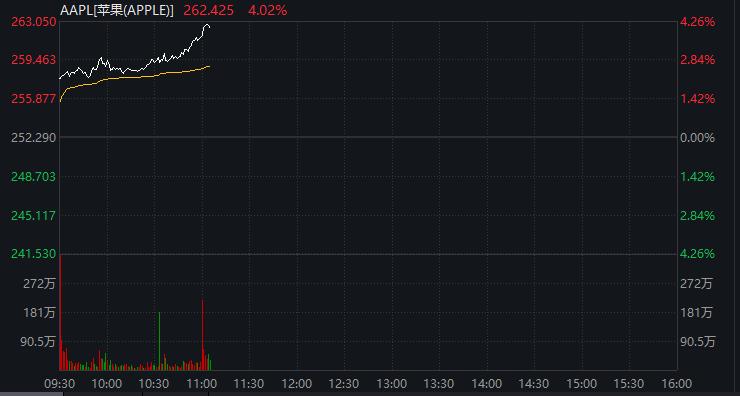 個股方面,美股科技七巨頭中,蘋果漲近4%,市值一夜大漲1476億美元(約合人民幣10517億元)。截至收盤,臉書漲超2%,亞馬遜、特斯拉、谷歌漲超1%。其中,蘋果股價盤中一度漲至263.05美元,創歷史新高。