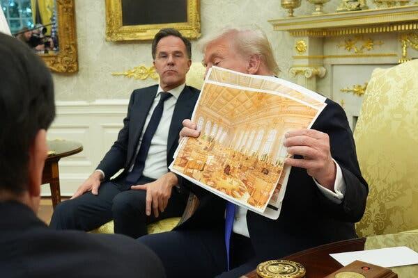 另據美國《紐約時報》報道,當被問及爲何在承諾“不損壞建築”後仍要拆除東翼整體建築時,特朗普當地時間22日手舉宴會廳效果圖回應稱,“這可能會是有史以來最精美的宴會廳。”