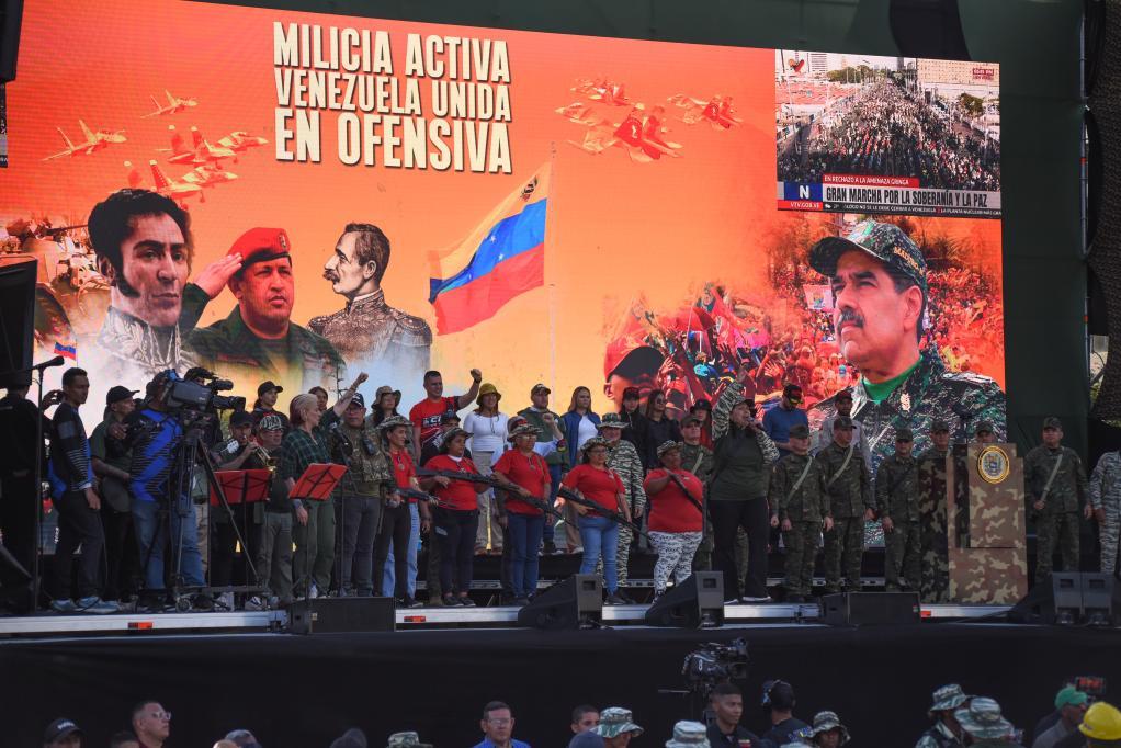 9月23日,在委內瑞拉首都加拉加斯,參加遊行活動的民衆和軍事人員在高呼口號。當天,加拉加斯民衆舉行大規模遊行,呼籲保衛委內瑞拉主權與和平,反對美國在加勒比海域的軍事威脅。新華社發(馬科斯·薩爾加多攝)