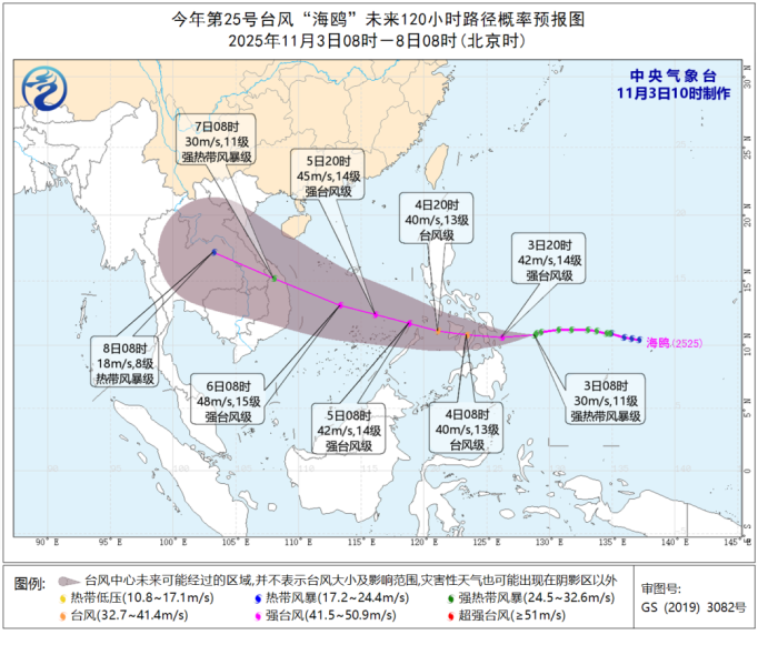 今年第25號颱風“海鷗”(強熱帶風暴級)的中心今天(3日)上午8點鐘位於菲律賓馬尼拉東偏南方向大約950公里的西北太平洋洋麪上,就是北緯10.8度、東經128.8度,中心附近最大風力有11級(30米/秒),中心最低氣壓爲980百帕,七級風圈半徑200-320公里,十級風圈半徑100-140公里。