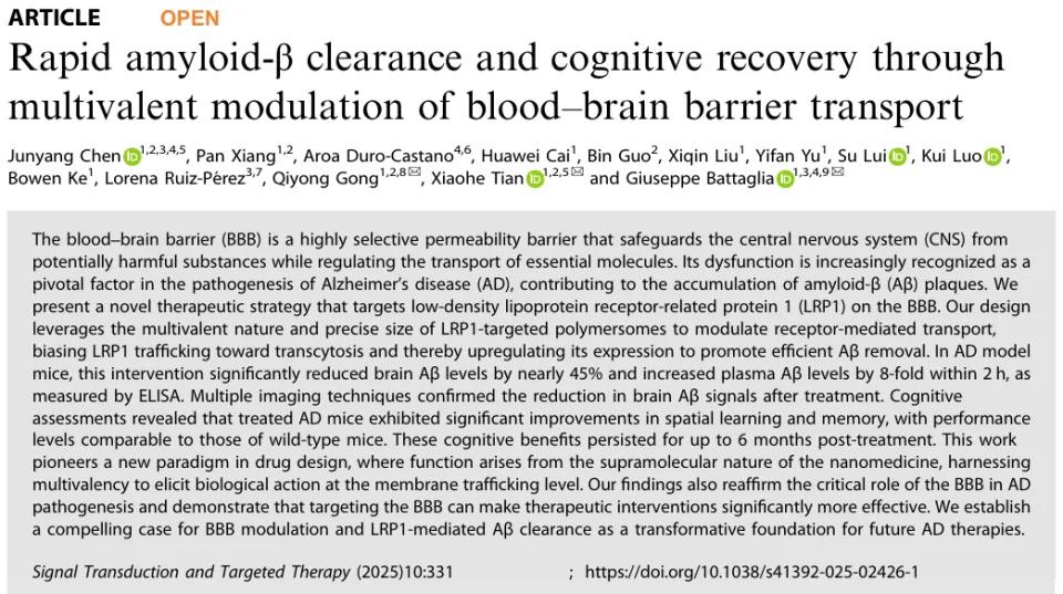研究團隊特製的納米粒子針對的是一種名爲LRP1的關鍵蛋白質,LRP1是血腦屏障中的“分子守門人”,它可以識別澱粉樣蛋白-β,與其結合,並將其運送穿過血腦屏障進入血液,然後在血液中將其清除。然而,在病變模型中該系統可能會發生故障,從而導致β澱粉樣蛋白在大腦內部積聚。此時,納米粒子就像一個“開關”,能夠重啓大腦中這一清除系統。