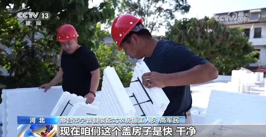邢臺市寧晉縣裝配式農房施工人員 高軍民: 原來用磚混蓋房子太累了,彎着腰,現在咱們蓋房子快、乾淨,一層一層垛起來,一層30公分,特別快。