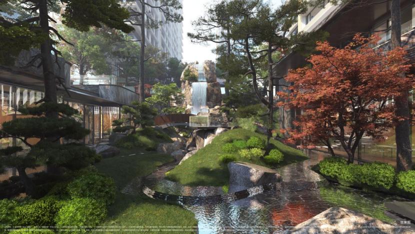 璞樾的景觀設計,超越了單純的綠化,升維爲一場“身心療愈”的體驗。項目提出“當代蘭亭·一里隱園”的概念,汲取麗茲卡爾頓隱世、六善等世界頂奢酒店的精神內核,與東方名畫《蘭亭修禊圖》的雅集意趣相融合。約1200米環形水系串聯起“寶格歸境”、“峽谷祕境”等六重風雅意境,並精選全球32種珍稀樹種,確保四季有景。這讓園林成爲可遊、可賞、可居的“心靈棲所”。