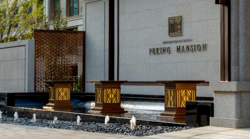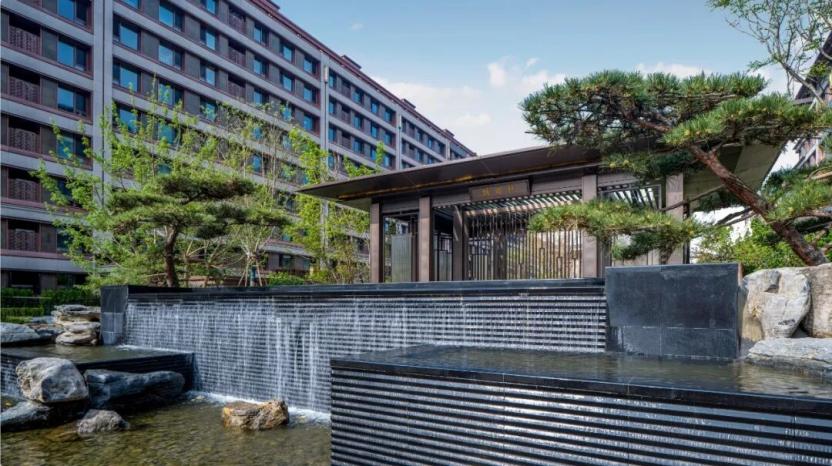 石材外立面搭配金屬鋁板和大面積玻璃窗,巧妙地將內城的文化符號與現代國際審美相融合。在實景呈現的園林中,疊石、流水與亭臺樓榭相互映襯,曲徑通幽,風景旖旎。