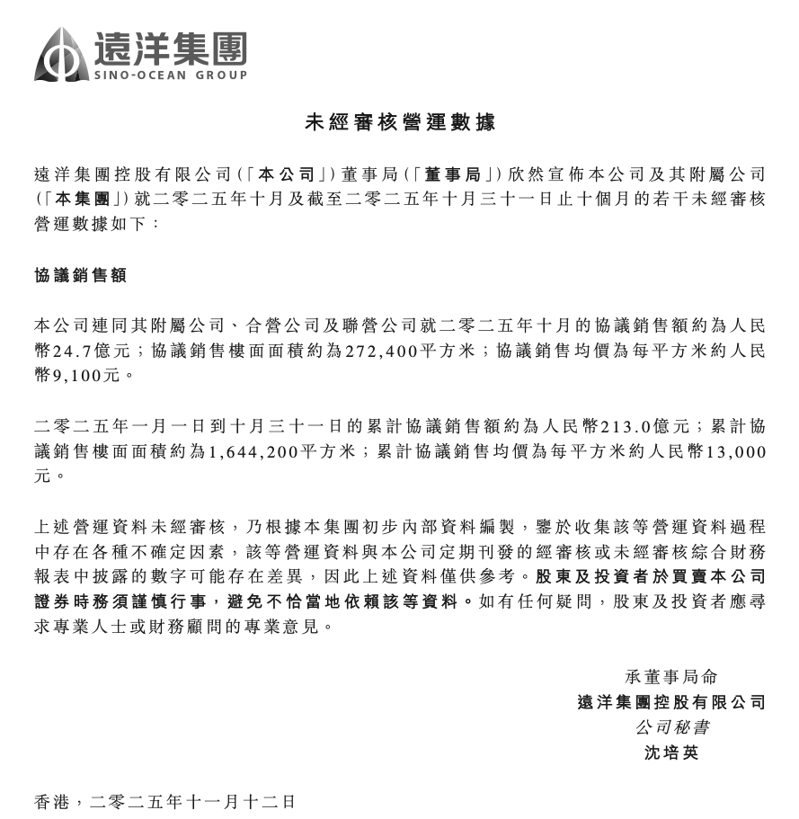 公告顯示,2025年10月,遠洋集團實現合約銷售額約24.7億元人民幣,銷售樓面面積約27.24萬平方米,合約銷售均價約爲每平方米9100元人民幣。