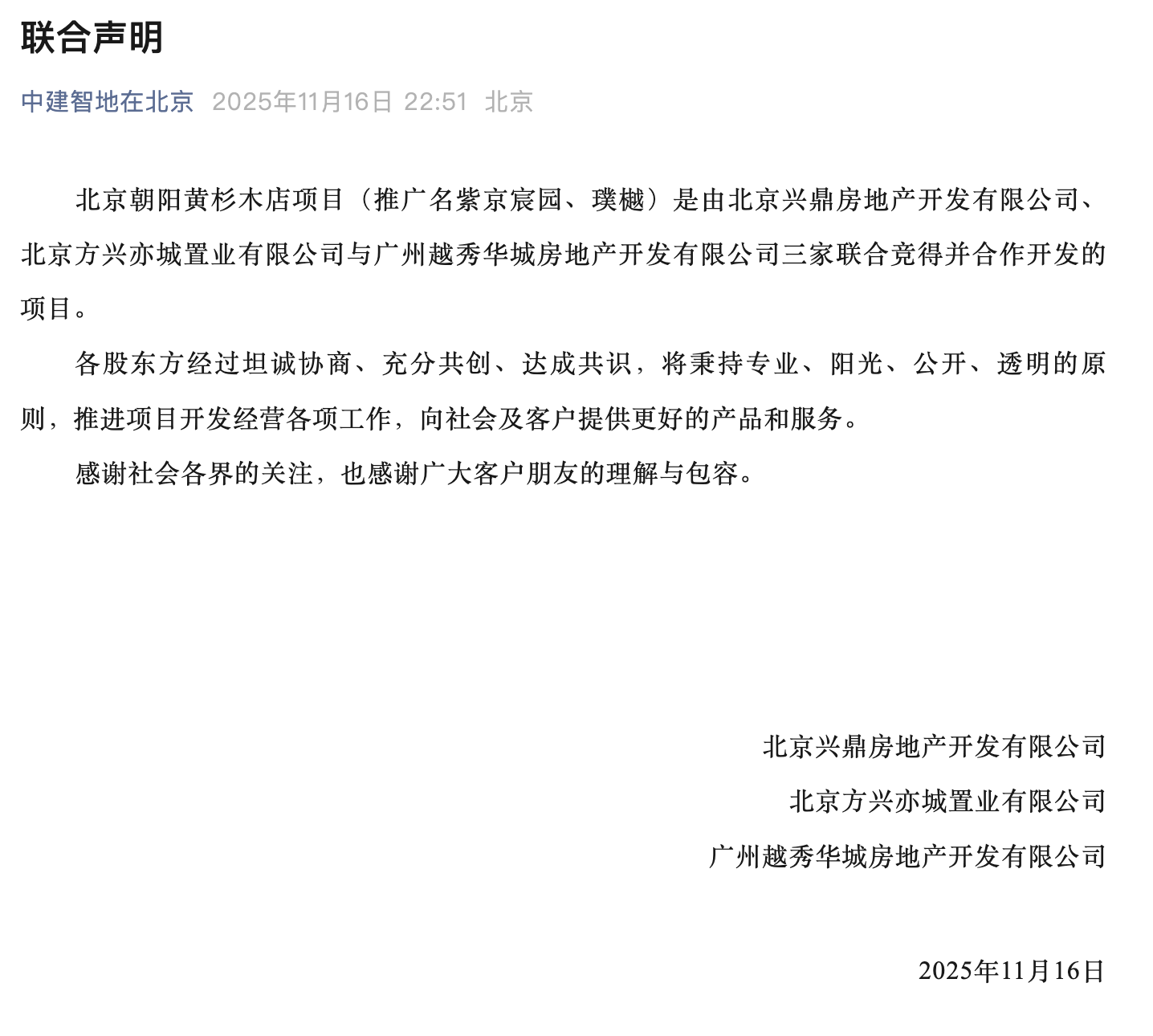 【環球網綜合報道】11月16日晚,北京興鼎房地產開發有限公司(中建智地+朝陽城開)、北京方興亦城置業有限公司(中國金茂)、廣州越秀華城房地產開發有限公司(越秀地產)發佈聯合聲明。