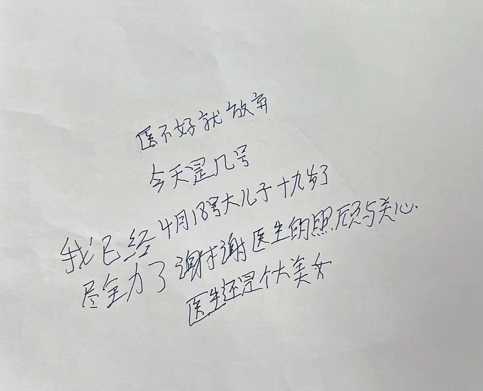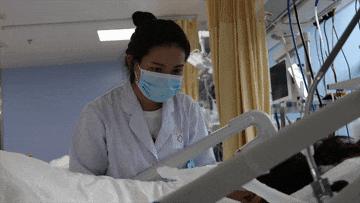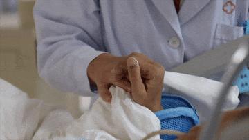 向仕菊醫生在ICU病房內與胡女士雙手緊握。