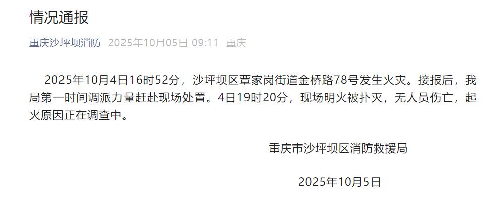 2025年10月4日16時52分,沙坪壩區覃家崗街道金橋路78號發生火災。接報後,我局第一時間調派力量趕赴現場處置。4日19時20分,現場明火被撲滅,無人員傷亡,起火原因正在調查中。