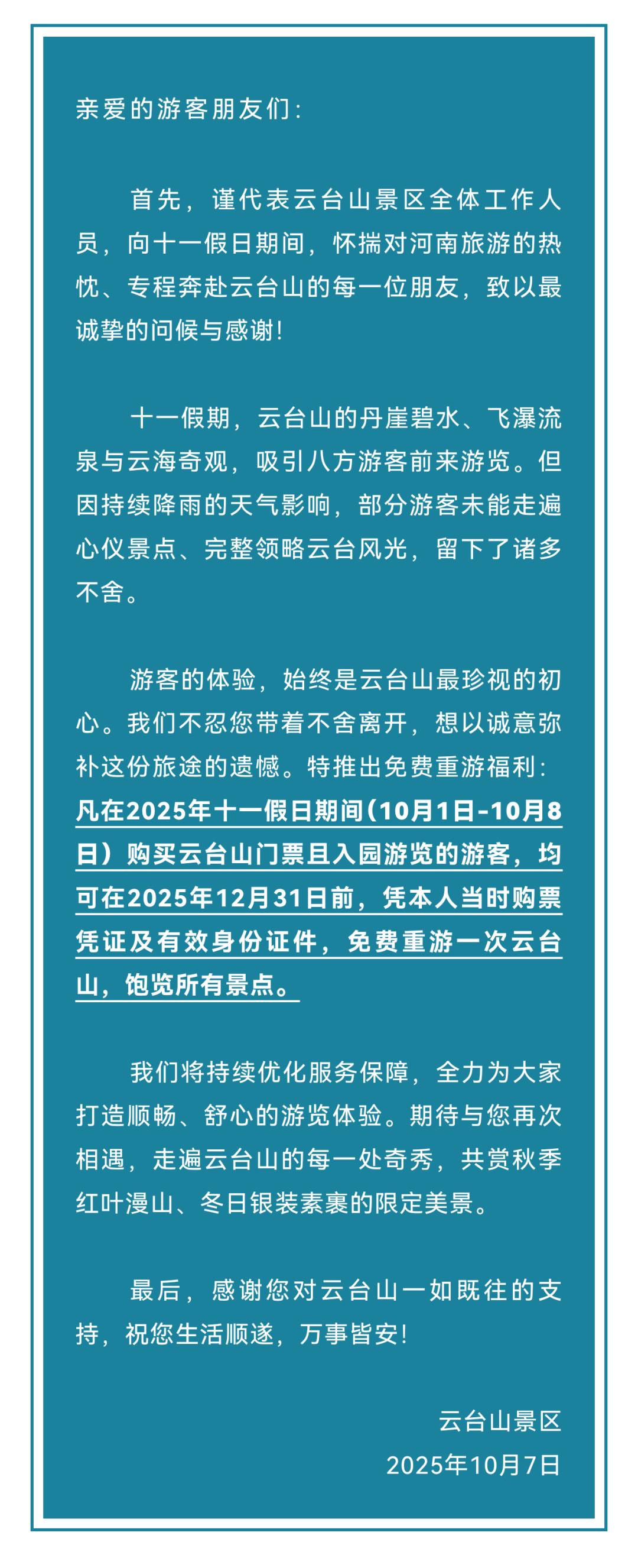 10月7日上午,雲臺山景區官方微信發佈消息,凡在2025年國慶假日期間(10月1日 - 10月8日)購買雲臺山門票且入園遊覽的遊客,均可在2025年12月31日前,憑本人當時購票憑證及有效身份證件,免費重遊一次雲臺山,盡情飽覽景區所有景點。