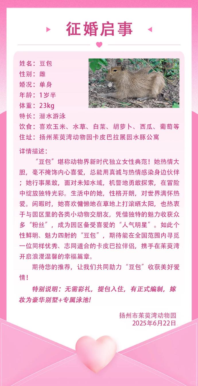 此前據媒體報道,6月22日,揚州市茱萸灣動物園發文,爲“豆包”徵婚:“親愛的全國動物園同仁們:自‘豆包’離家出走兩個月,回家以後遭遇‘霸總’和‘躲躲’的冷暴力,且經飼養員多次調解無效,現‘小氣巴拉’園長誠邀各園推薦優質卡皮巴拉候選豚,攜手爲‘豆包’尋覓良緣!”