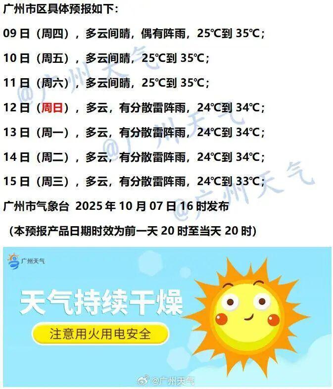 據廣東氣象臺10月8日19時預報,預計9-11日,廣東大部晴到多雲爲主,粵西多雲間陰天有分散小雨。最高氣溫:粵西31~33℃,其餘市縣33~36℃,局部37℃。