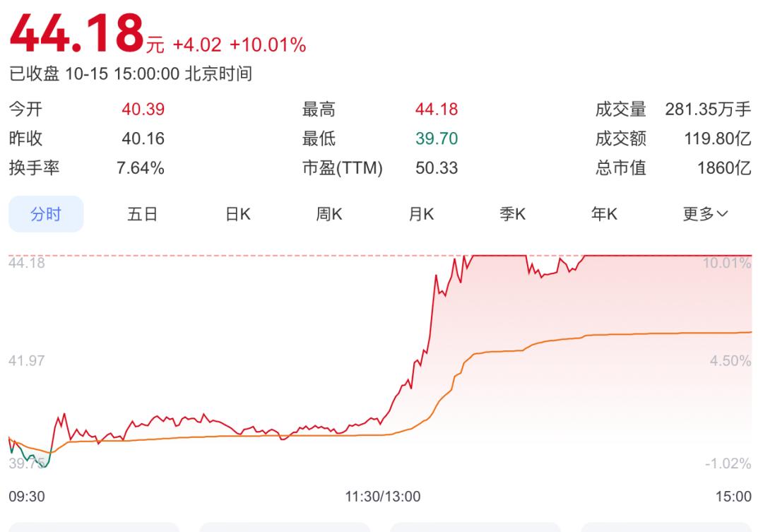 10月15日,三花智控尾盤強勢拉昇封漲停,截至收盤,該股報44.18元/股,全日成交近120億元;其港股亦大幅走高,收盤漲約13%。