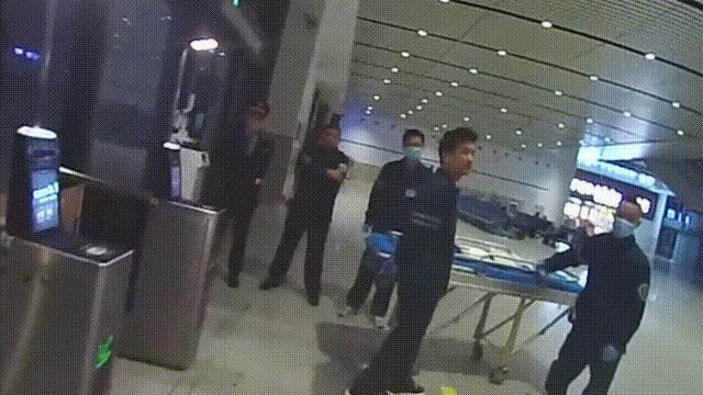 19時37分 ,車站工作人員引導醫護人員到達站臺等候列車。
