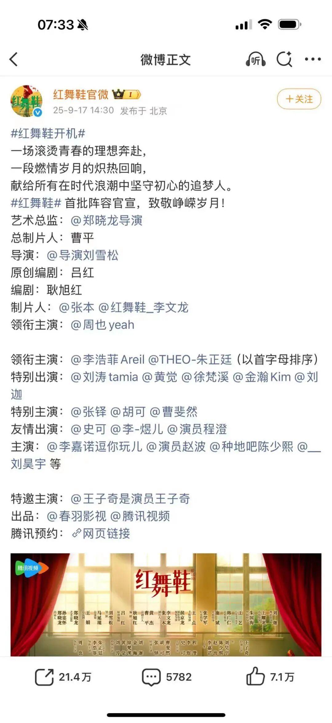 公開信息顯示,《紅舞鞋》是由春羽影視、騰訊視頻出品,鄭曉龍擔任藝術總監,曹平擔任總製片人,劉雪松執導,呂紅原創編劇,耿旭紅編劇,周也等主演。