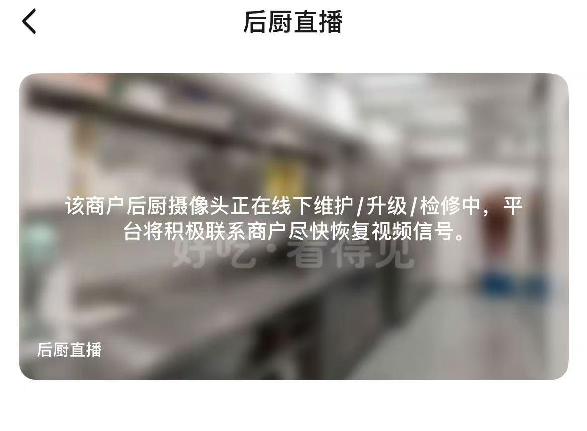 在外賣平臺上,記者確實看到了一些店鋪顯示有“直播”板塊,但目前很多點擊後卻無法順暢播放。例如一家川湘菜檔口的“後廚直播”,點擊後顯示“該商戶後廚攝像頭正在線下維護/升級/檢修中,平臺將積極聯繫商戶儘快恢復視頻信號。”