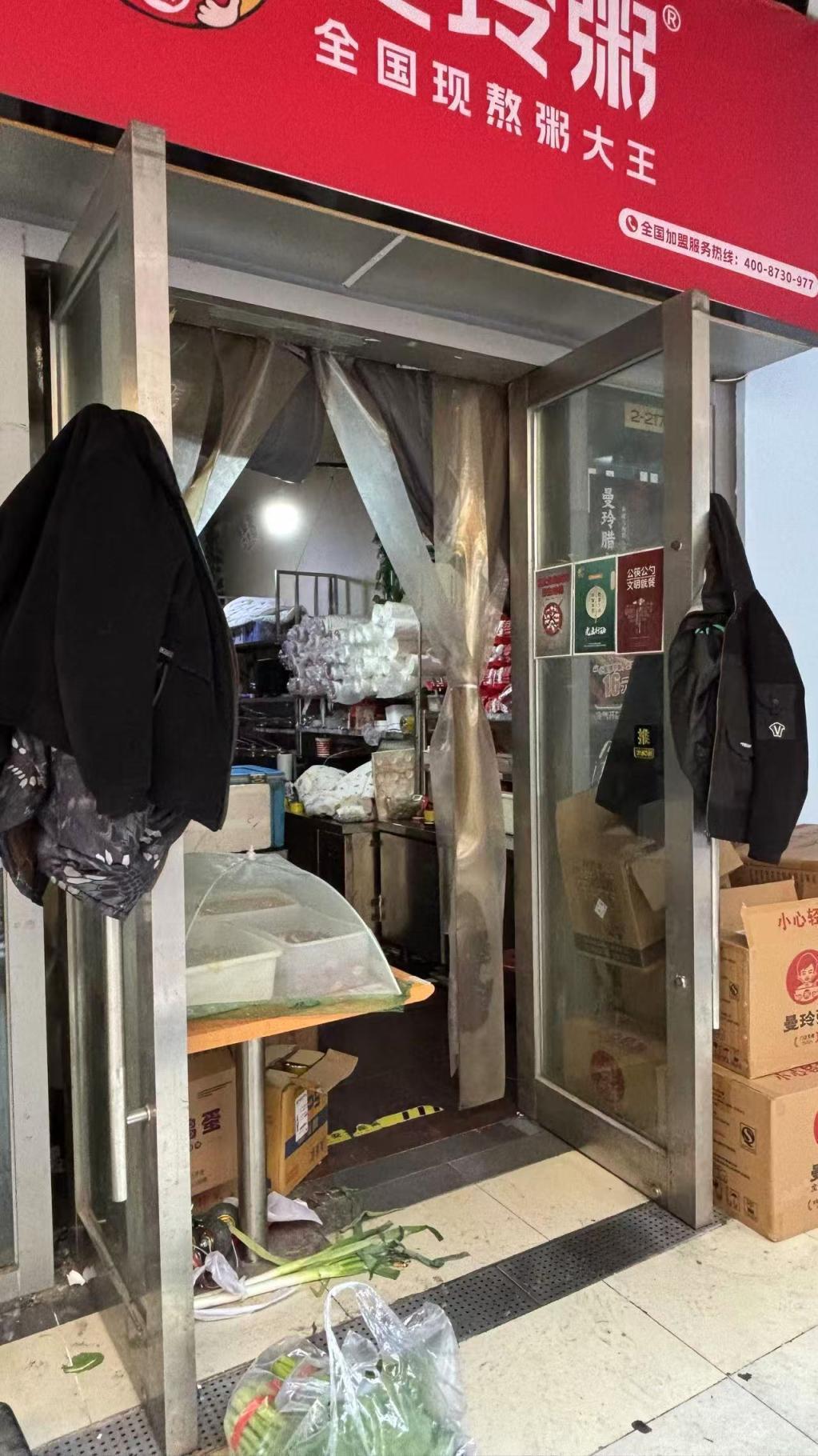 此外,還有一家主打“現熬粥”的連鎖店,其平臺“實拍圖”顯示,堂食區域至少有六組桌椅。記者在現場看到,該檔口實際上僅有操作區域,貨架滿滿當當,員工的外套只能搭在門把上,袋裝蔬菜直接置於門外地面,並無堂食空間。