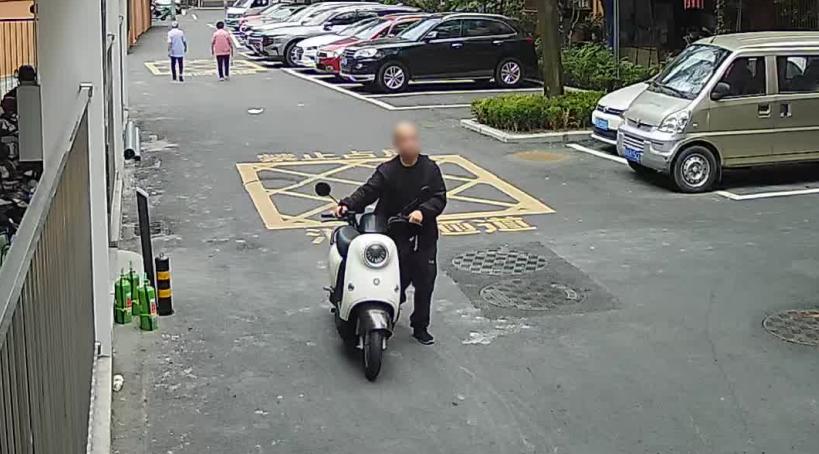 小區監控畫面顯示,該男子尾隨小區居民進入小區,只見他右手拎着個口袋,左手攥着瓶礦泉水,大步流星,乍一看,活像剛買完東西準備回家的小區居民。幾分鐘後,該男子再次出現在監控畫面中時,卻多出了一輛電瓶車,只見他一路推行,離開了小區。