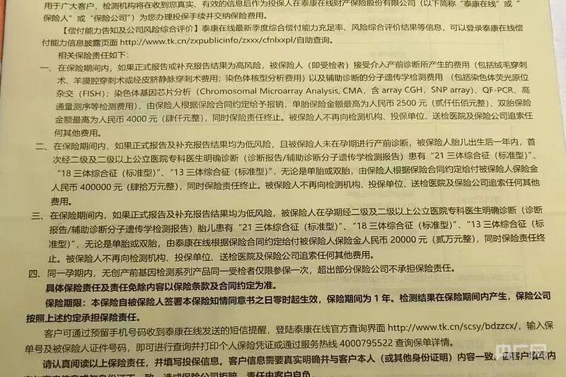 相關工作人員向杜先生夫婦介紹,投保後,如果孕檢檢測結果顯示胎兒有唐氏低風險,而孩子出生後患有唐氏綜合徵,泰康在線將支付誤判補償保險金40萬元。杜先生的妻子考慮到檢測盒投保是捆綁的,所以在《保險知情同意書》上籤了字。