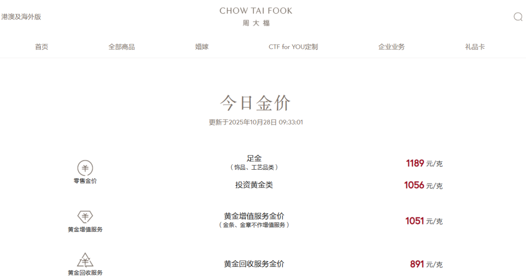 記者查詢發現,老廟黃金報價1192元/克,較前一日下跌28元/克;周生生報價1199元/克,較前一日下跌24元/克 ;周大福報價1198元,單日下跌25元;老鳳祥報價1202元/克,單日下跌18元/克。