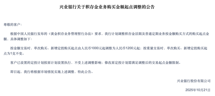10月21日,興業銀行 發佈公告稱,該行計劃調整積存金活期及普通定期業務按金額購買方式的購買起點金額。按金額交易時,單次購買、新增定投購買起點由人民幣1000元起調整爲人民幣1200元起;按重量交易時,單次購買、新增定投購買起點爲1克不變。