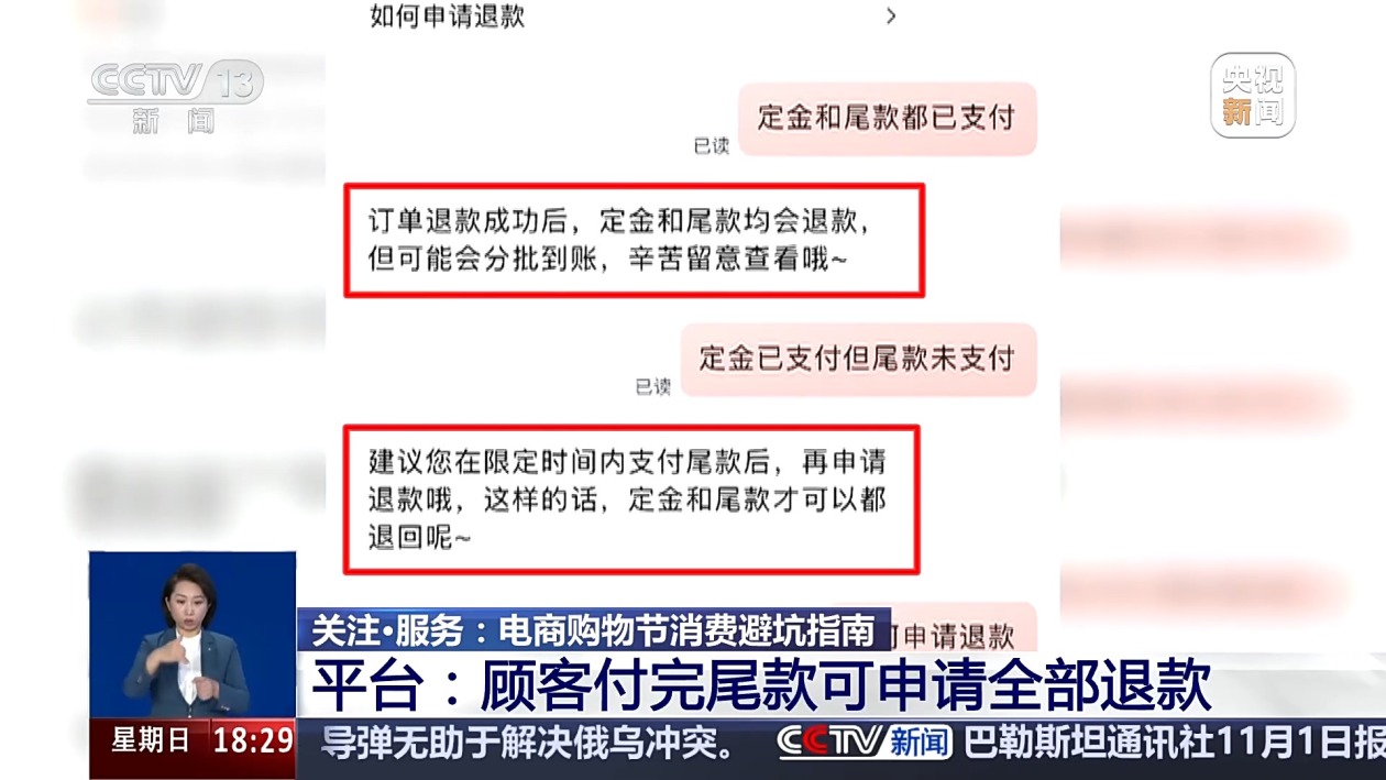 平臺客服同時表示,如果消費者遇到尾款支付出現故障的情況,可以第一時間與平臺和商家聯繫說明,由商家專門開設退款入口,退還“定金”。
