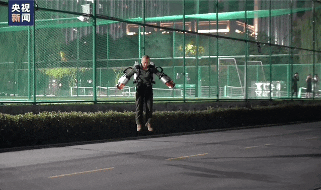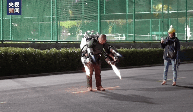 伴隨着一陣轟鳴,一名男子揹着一個“大包”,雙臂張開,只見他用力一蹬,竟飛到了離地近兩米的半空中,並穩穩懸停!