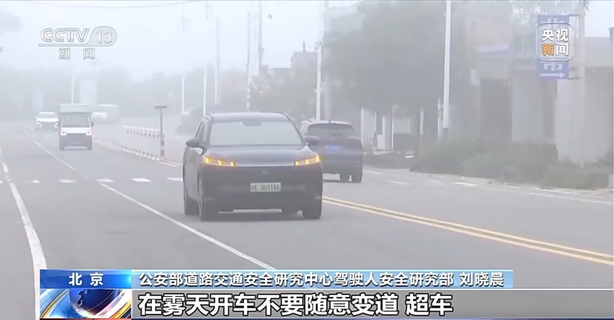 公安部道路交通安全研究中心駕駛人安全研究部 劉曉晨:大家還要注意不要盲目地變道超車,霧天的能見度較低,無法準確地判斷車距,又不利於觀察相鄰車道和對向來車的情況。在霧天開車不要隨意變道超車,經過互通出入口或者其他車流密集的區域,要注意提前備剎車,謹防其他車輛突然併入,發生事故。