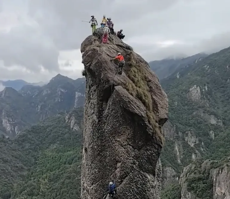 記者從視頻中看到,該峯形似一根立柱,四周巖壁幾乎垂直,直衝地面,而峯頂可供站立的平臺幾乎沒有,看上去頗爲危險。