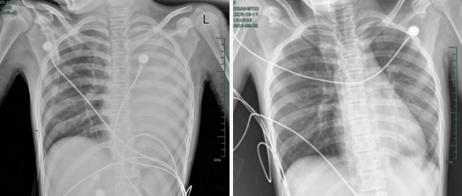 據介紹,笑笑一開始只是輕微咳嗽,發熱到38℃,檢查提示肺炎、肺不張,轉診到浙大四院兒科時,病情已經急劇惡化,出現呼吸急促、胸悶胸痛,體溫38.5℃,只能靠5L/min的面罩吸氧維持血氧,胸片顯示左肺已完全呈 “白肺” 改變,肺部炎症進展迅猛。