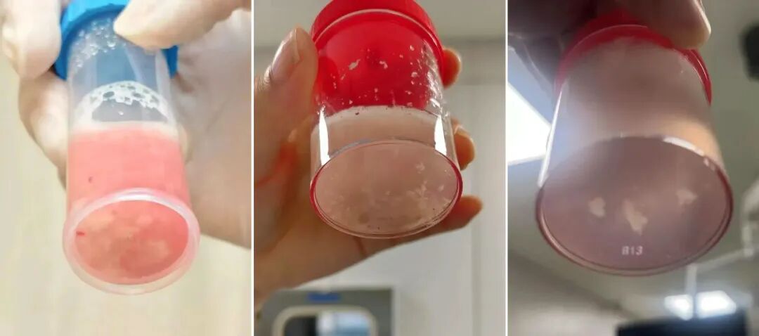 從左至右分別爲三次支氣管鏡取出的塑型,第3次塑型明顯減少,灌洗液也比之前清亮。
