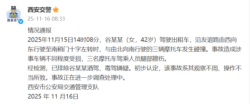 2025年11月15日14時08分,谷某某(女,42歲)駕駛出租車,沿友誼路由西向東行駛至南稍門十字左轉時,與由北向南行駛的三輛摩托車發生碰撞。事故造成涉事車輛不同程度受損,三名摩托車駕乘人員腿部擦傷。