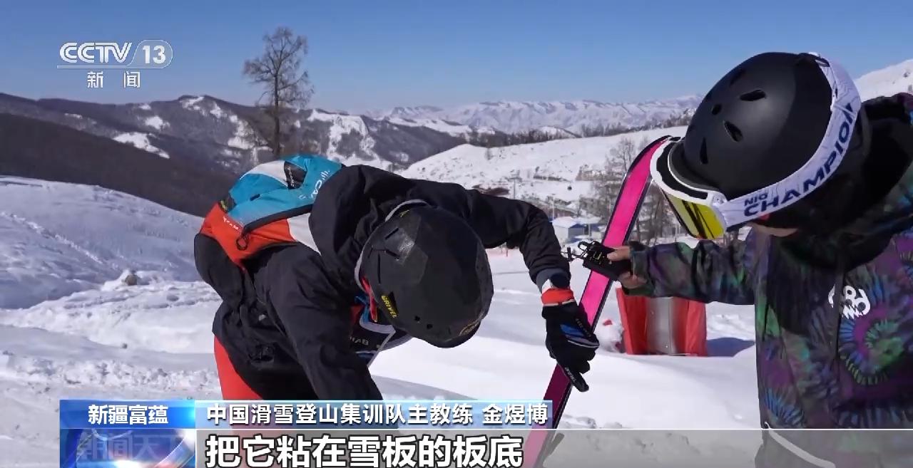 中國滑雪登山集訓隊主教練 金煜博:比如說從山頂下滑到一個區域,那我們需要再上升的時候,我們就需要先把這個雪板脫下來,把雪板的板底擦乾淨,然後把這個止滑帶粘在雪板的板底。然後再穿上,這樣就可以正常地行走了。